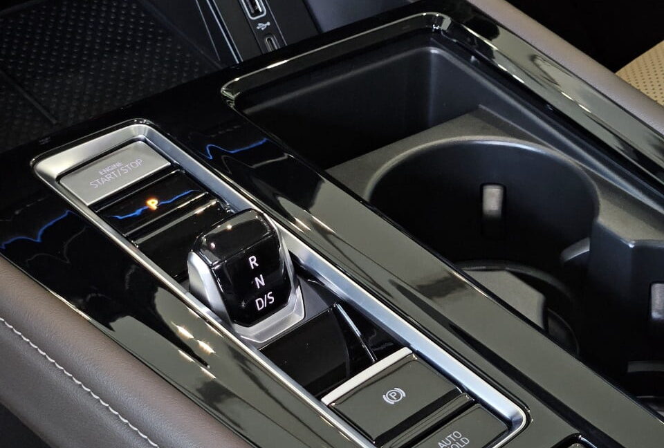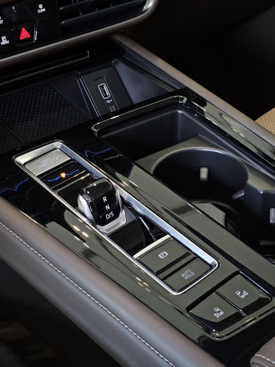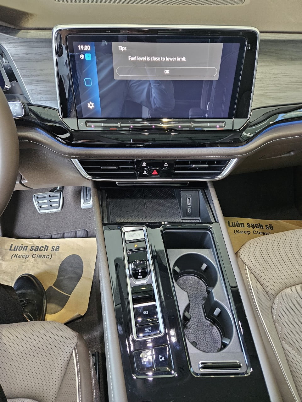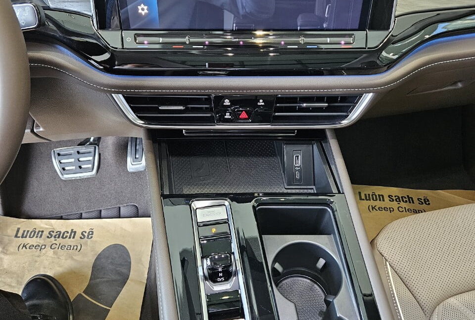 Cụm cần số trên chiếc MPV 7 chỗ cỡ lớn được cách điệu lại hoàn toàn. Cần số hiện đại dạng số lẫy, vừa tinh tế vừa mang lại cảm giác quen thuộc. Cạnh bên là hốc để đồ tiện lợi cùng một số chi tiết khác bao gồm nút khởi động, phanh tay điện tử, Auto Hold, nút mở cửa trượt 2 bên dành cho hành khách và chủ tịch.