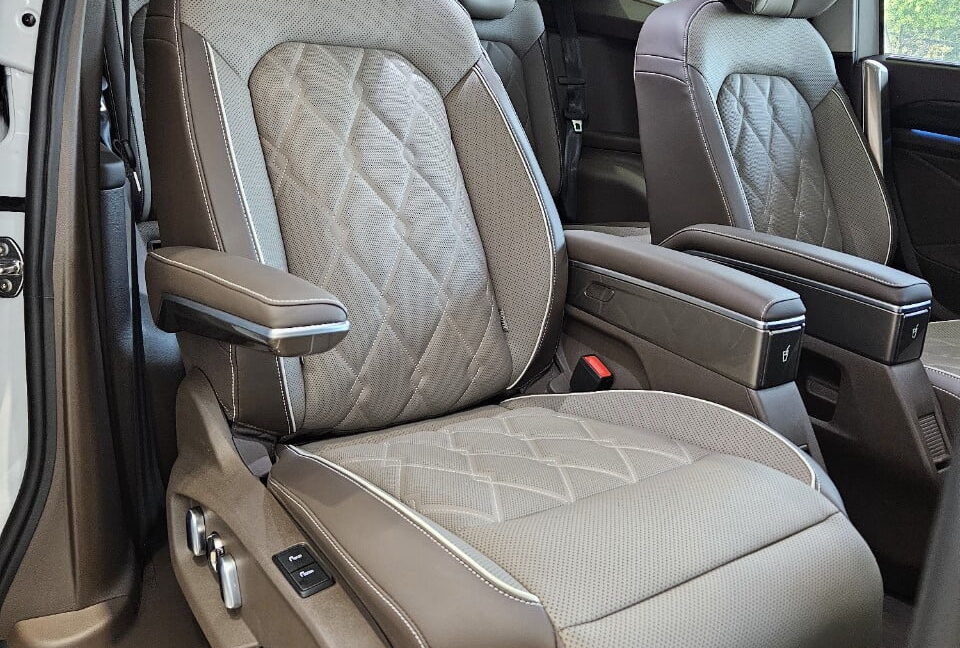 Hàng ghế trước có thể chỉnh điện lên đến 8 hướng, hỗ trợ sưởi ấm ghế. Khoảng để chân tại đây được tối ưu nên hành trình đi xa không bị mỏi. Ngoài ra, ghế lái còn được trang bị thêm hệ thống bơm hơi lưng ghế và bộ nhớ 3 vị trí tiện lợi cho ghế trước.
